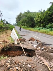 “Lubangnya lebar dan dalam, jika tidak segera ditangani serius oleh Dinas terkait,bukan tidak mustahil ada pengendara yang terjebak dan bahkan akan menimbulkan korban jiwa.Selain itu lubang akan semakin semakin besar dan panjang serta berpotensi jalan tersebut akan putus,” katanya.