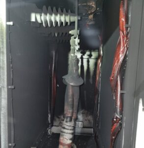 Akibat kubikel meledak, hari ini petugas melakukan pekerjaan pengamanan penarikan kabel SKTM untuk perbaikan kabel SKTM yang terbakar di kubikel gardu hubung Muara Beliti.
